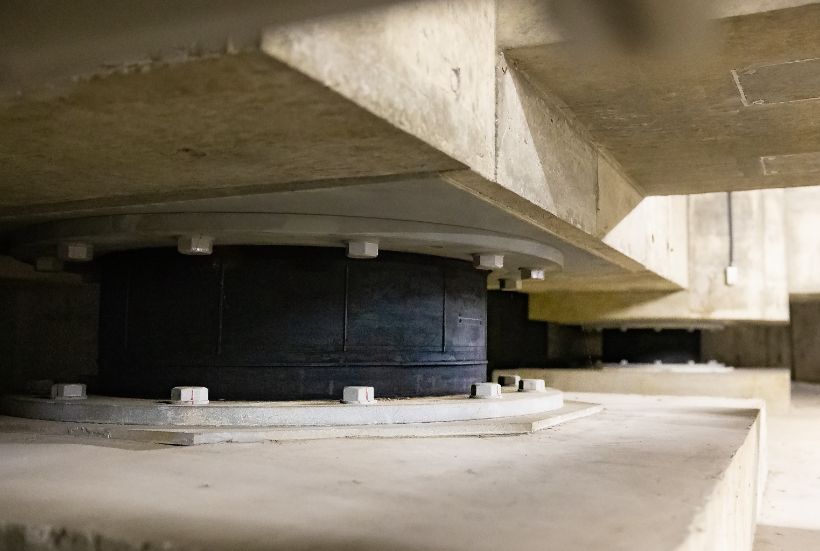 東京駅丸の内駅舎改修工事でも採用された免震構造。高層ビルやタワーマンションで採用されているブリヂストンの免震ゴムを起用した免震構造で皆さまの生活を守ります。