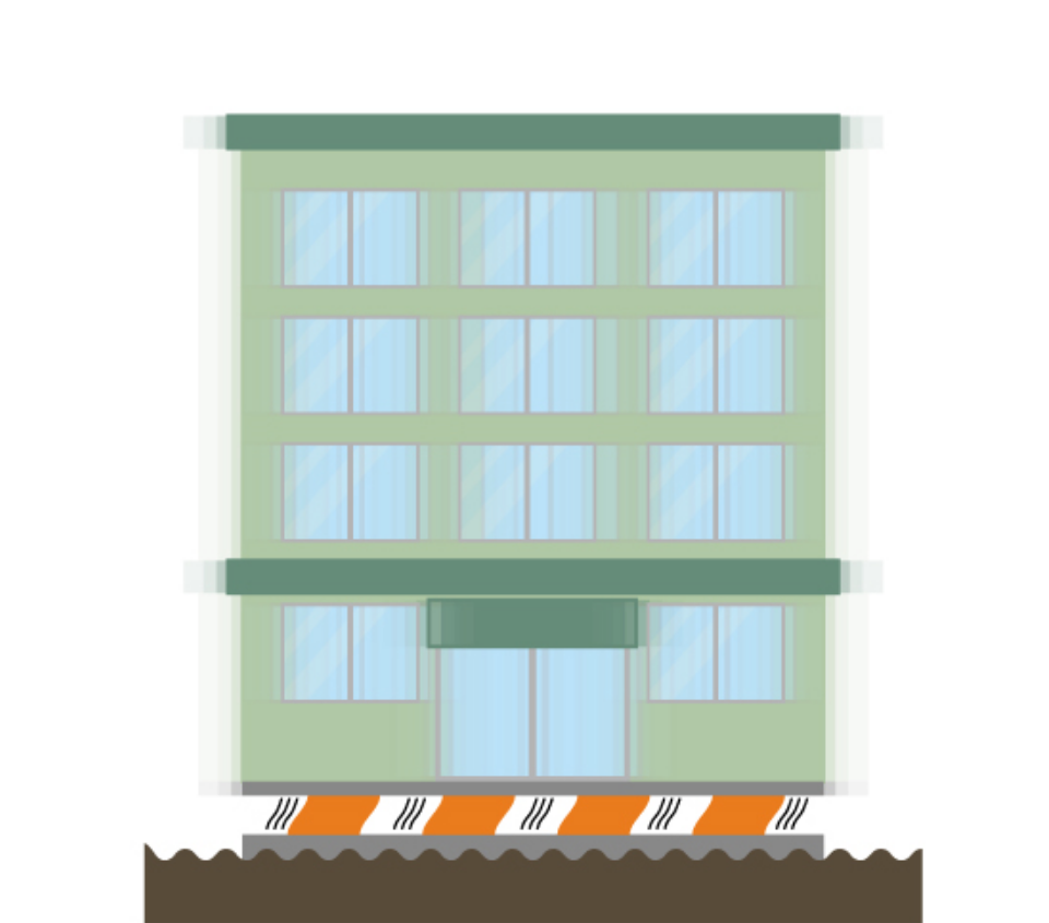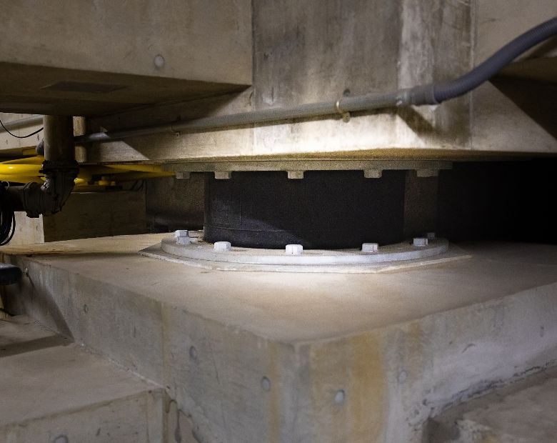 地震が来るとゆっくり揺れます。地震時に免震装置が地震の揺れを吸収することで建物に地震の揺れが少なくなり、お部屋の家具などが倒れにくくなります。